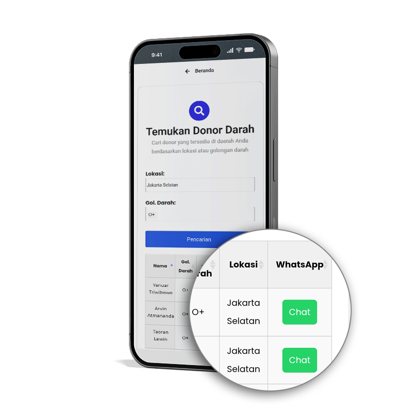 • Menghubungi pendonor melalui tombol WhatsApp tanpa menampilkan nomor telepon secara publik